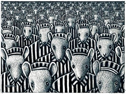 En effet, à la page 48 de l’œuvre (édition de 1996), on peut trouver le discours suivant, qui incarne le système politique dans la métaphore du camp de concentration ;